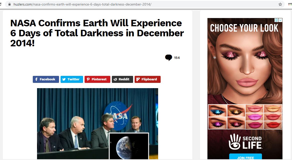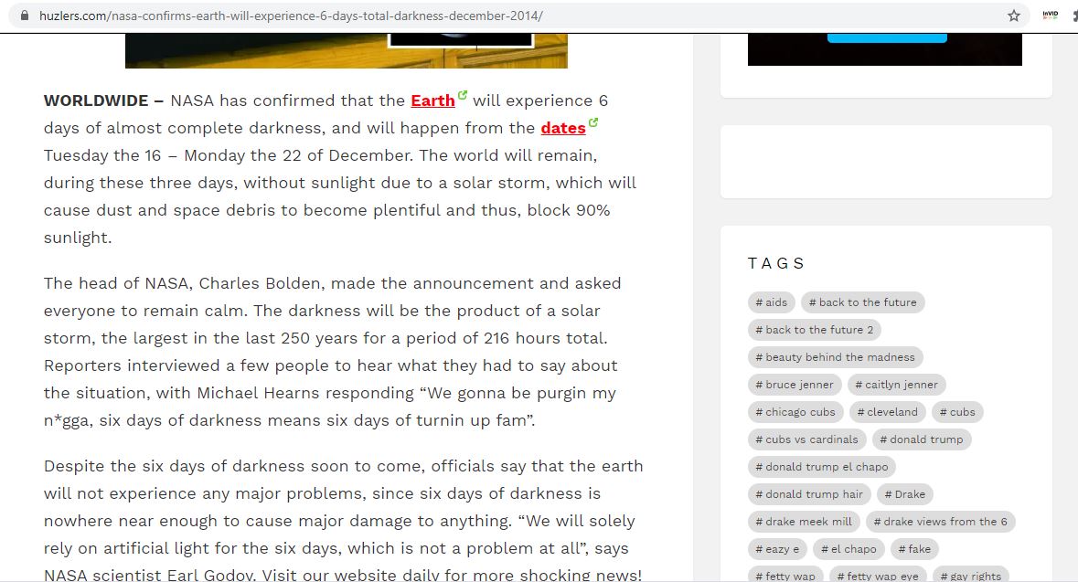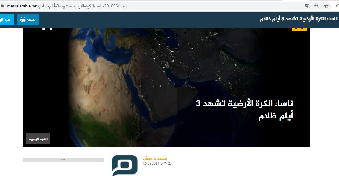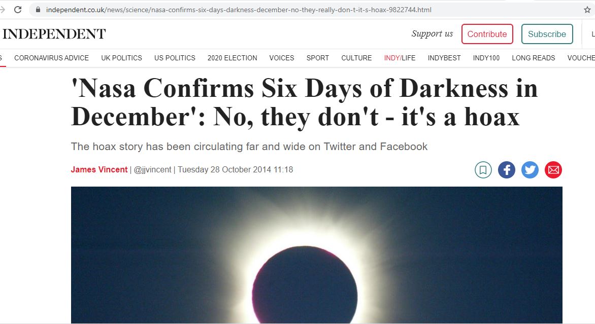 في واقع الأمر، فقد تبيّن بعد التدقيق ان مصدر هذا الخبر هو موقع Huzlers الساخر، الذي اختلقه ونشره يومذاك بعنوان: "ناسا تؤكد أن الأرض ستشهد 6 أيام من الظلام الكامل في كانون الاول 2014"، زاعما ان "هذه الظاهرة ستحصل من 16 كانون الاول 2014 الى 20 منه".
