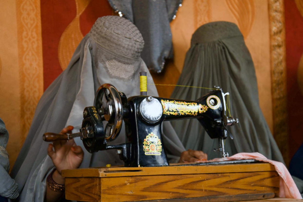 سيّدة ترتدي البرقع في معمل للحياكة في مدينة قندهار الأفغانيّة في الثلاثين من تموز 2022 ( AFP / JAVED TANVEER)