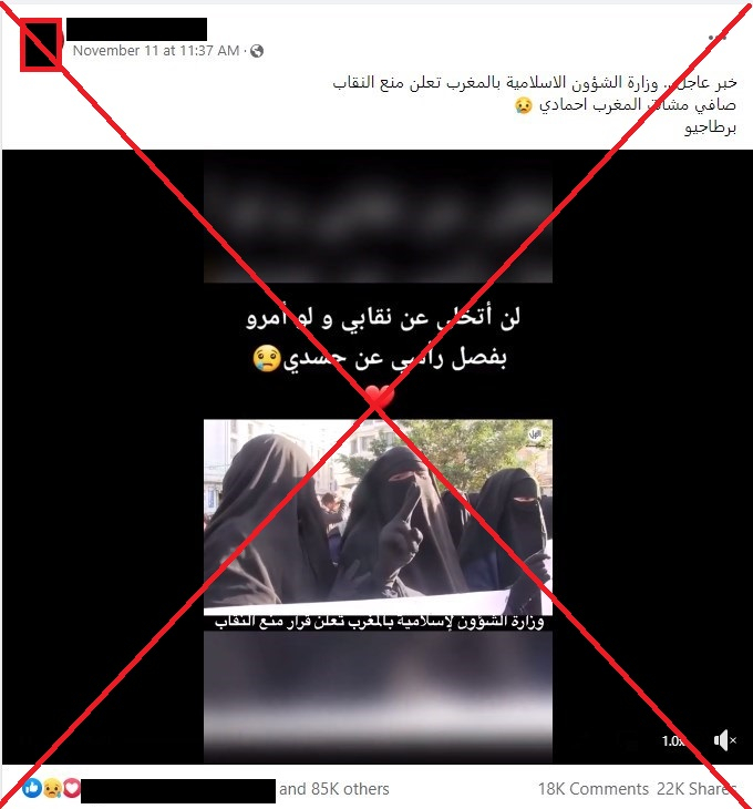 وجاء في التعليق المرفق أن وزارة الشؤون الإسلاميّة في المغرب تعلن منع النقاب"، وأرفق الخبر بوسم "عاجل"، ما يوحي بأن قراراً لمنع النقاب في المغرب اتُخّذ في الأيام الماضية.