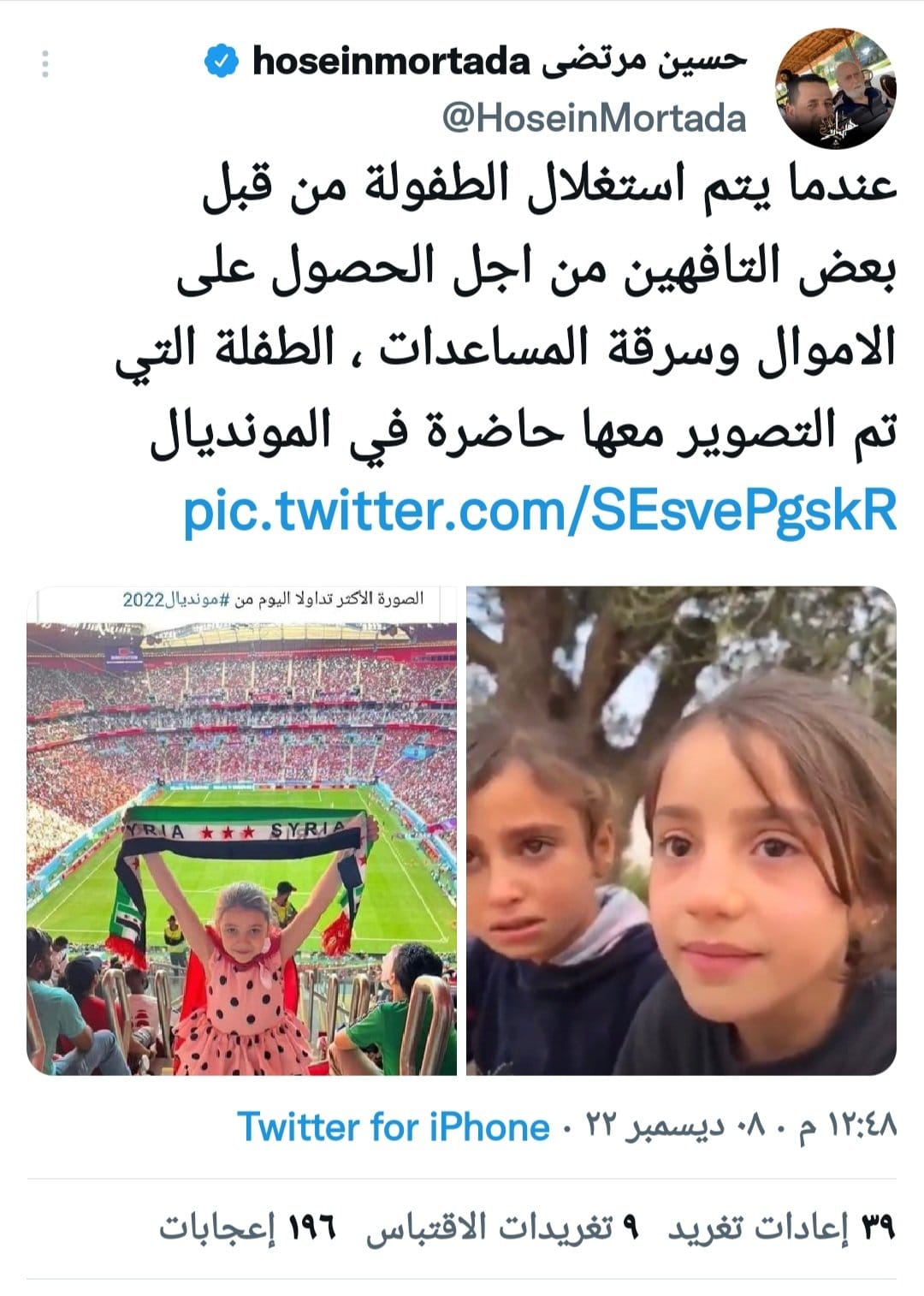 الوقائع: منذ ايام، تكثّف التشارك في تغريدة، عبر حسابات (هنا، هنا، هنا...) تضمنت صورتين أرفقتا بالمزاعم الآتية: "عندما يتم استغلال الطفولة من قبل بعض التافهين من اجل الحصول على الاموال وسرقة المساعدات، الطفلة التي تم التصوير معها حاضرة في المونديال".
