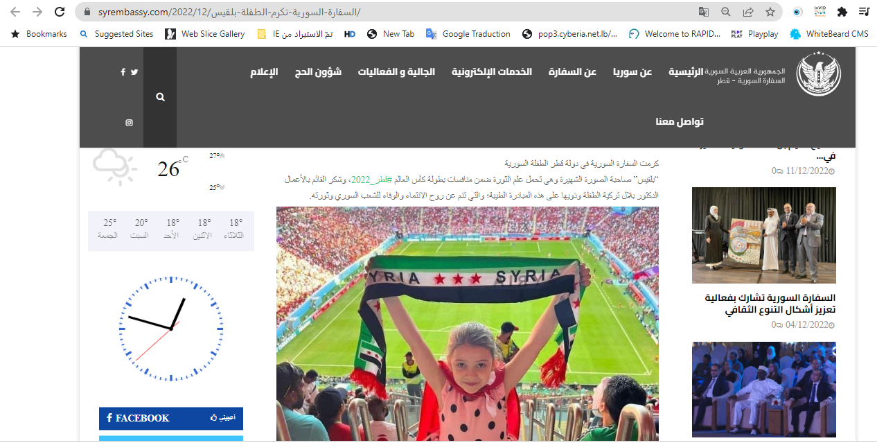 النتيجة: اذا لا صحة للمزاعم ان "الفتاة التي أبكت العالم بسبب معاناتها مع البرد في أحد مخيمات اللجوء السورية هي نفسها في أحد ملاعب قطر". في الواقع، الفتاة السورية التي تظهر في احد الملاعب خلال مونديال قطر اسمها بلقيس محمد الخليل، ولا علاقة لها بالفتاة السورية اللاجئة صبا.