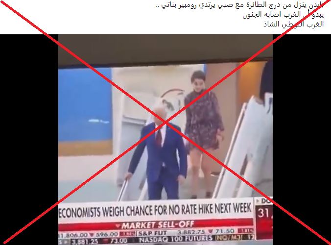"هذا كثير جدا"، وفقا للتعليق. فيديو يتناقله مستخدمون لوسائل التواصل الاجتماعي فيديو بمزاعم انه يظهر "الرئيس الاميركي جو بايدن ينزل سلم الطائرة مع صبي يرتدي رومبير بناتيا". غير أنّ هذا الزعم غير صحيح. في الواقع، من يشاهد خلف بايدن على سلم الطائرة هو حفيدته ناتالي (18 عاماً) التي كانت برفقته لدى وصوله الى لاس فيغاس، في 14 آذار 2023. FactCheck#