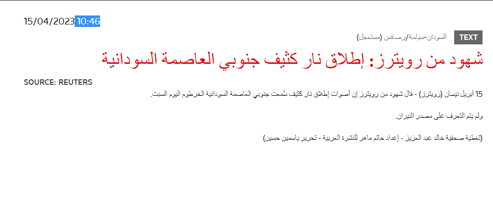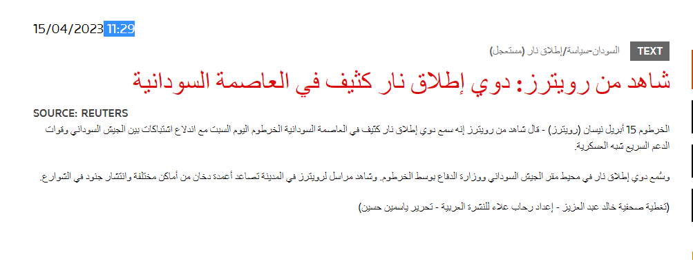 يشار الى القوات المسلحة السودانية نشرت مشاهد من الفيديو في صفحتها في الفايسبوك، الساعة 4.50 صباح السبت 15 نيسان (هنا)، مرفقاً بتعليق: الجيش صاحي، اي قبل ساعات قليلة جدا من إعلان سماع دوي انفجارات واطلاق نار في مناطق مختلفة من الخرطوم قبل ظهر السبت (هنا...) وتبادل الجيش السوداني وقوات الدعم السريع الاتهامات بالمبادرة الى القتال (هنا).