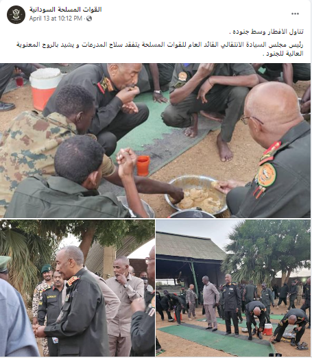 الخميس 13 نيسان، زار البرهان سلاح المدرعات، على وقع توتر كبير حاصل بين الجيش وقوات الدعم السريع في السودان، على ما اورد موقع "الجزيرة" (هنا). وقد نشرت القوات المسلحة السودانية في صفحتها في الفايسبوك صورا للبرهان بين الجنود وقت أذان المغرب، الخميس، وقالت إنه "تناول الإفطار وسط جنوده" (هنا).