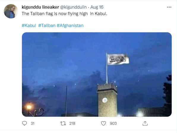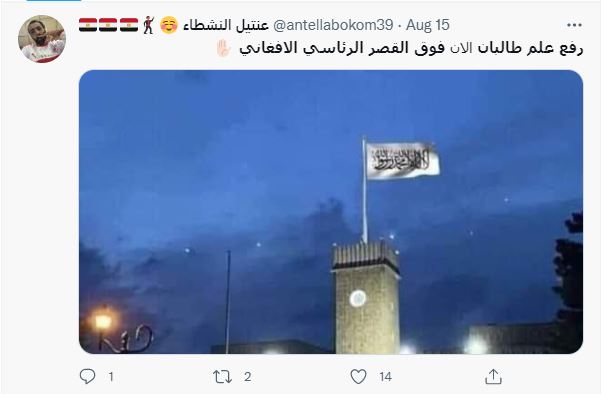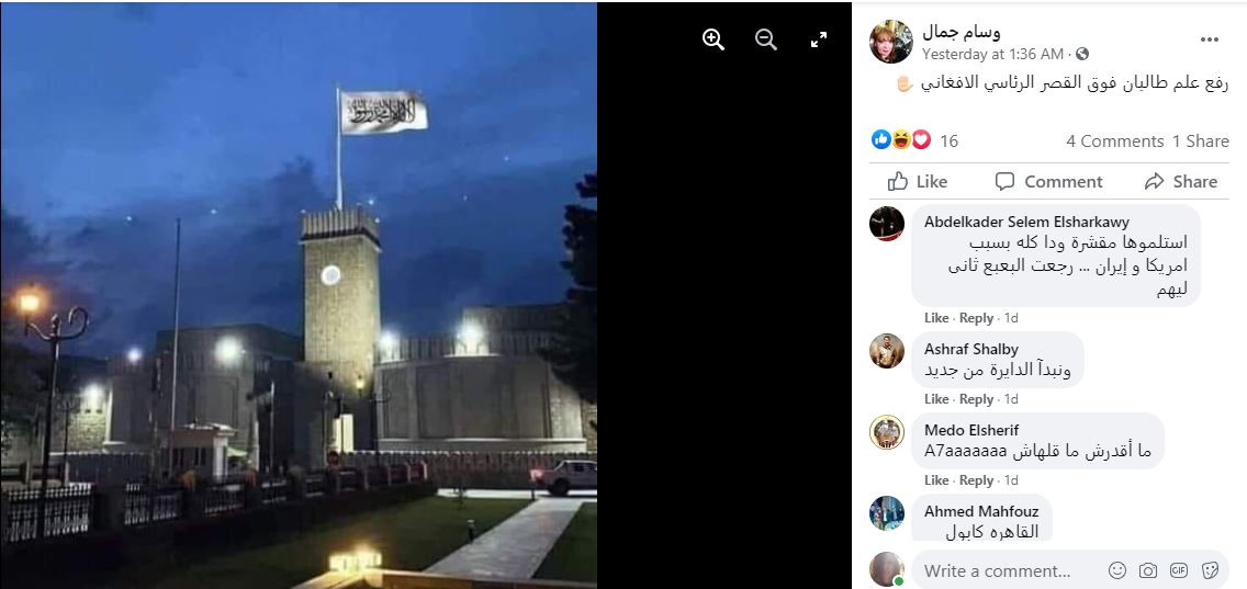 الوقائع: منذ ساعات، تتشارك في الصورة صفحات وحسابات، في الفايسبوك (هنا، هنا، هنا...)، وتويتر (هنا...). وقد أرفقت بالمزاعم الآتية (من دون تدخل أو تصحيح): "رفع علم طالبان فوق القصر الرئاسي الافغاني".