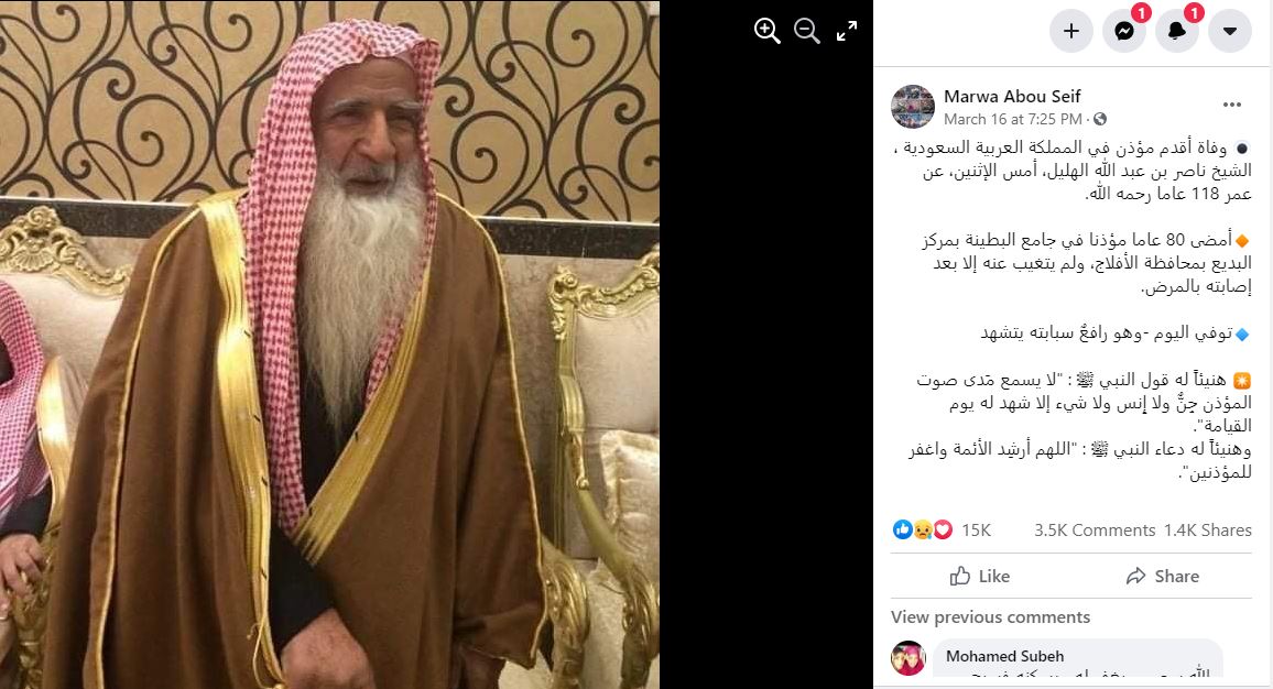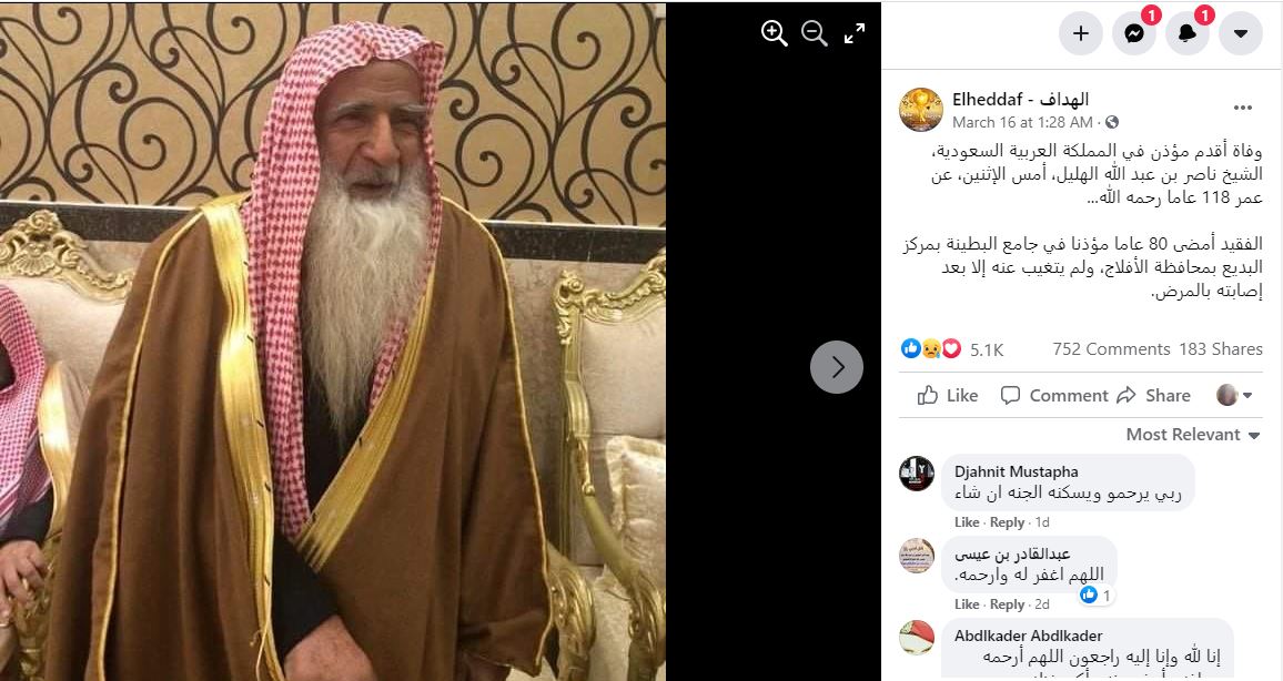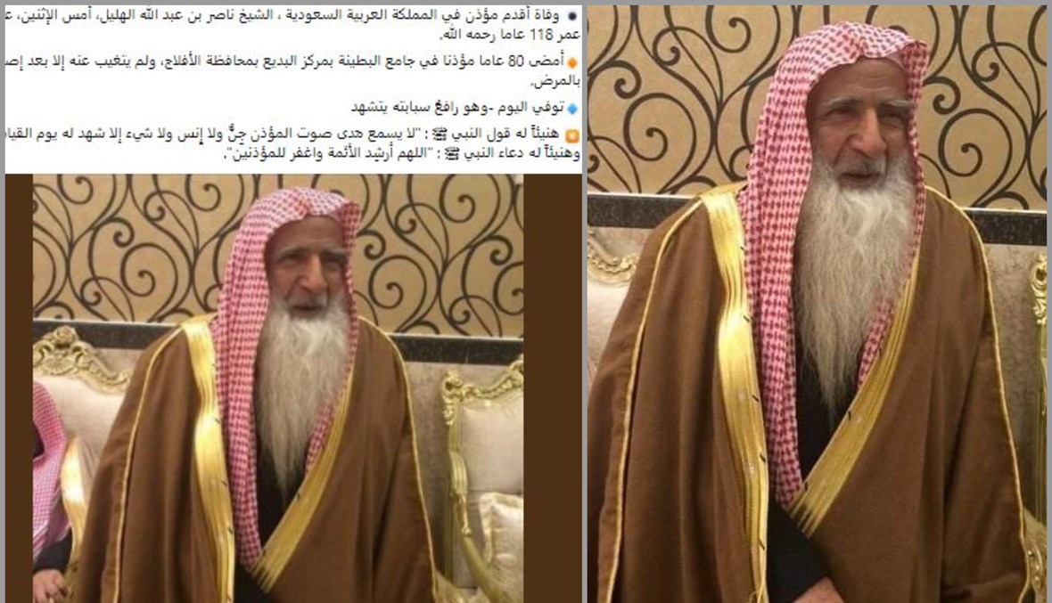 يتناقل مستخدمون لوسائل التواصل الاجتماعي صورة بمزاعم انها تظهر "أقدم مؤذن في المملكة العربية السعودية الشيخ ناصر بن عبد الله الهليل الذي توفي عن عمر 118 عاما". صحيح أن الموت غيّب، الاثنين 15 آذار 2021، أقدم مؤذن في السعودية الشيخ ناصر بن عبدالله الهليل، عن عمر ناهز 118 عاما، وفقا لتقارير اعلامية سعودية، الا ان الصورة المتناقلة تظهر "أقدم خطيب جامع ومؤذن في منطقة حائل الشيخ هليل بن سودان الشمري، الذي توفي في 16 تموز 2020". FactCheck#
