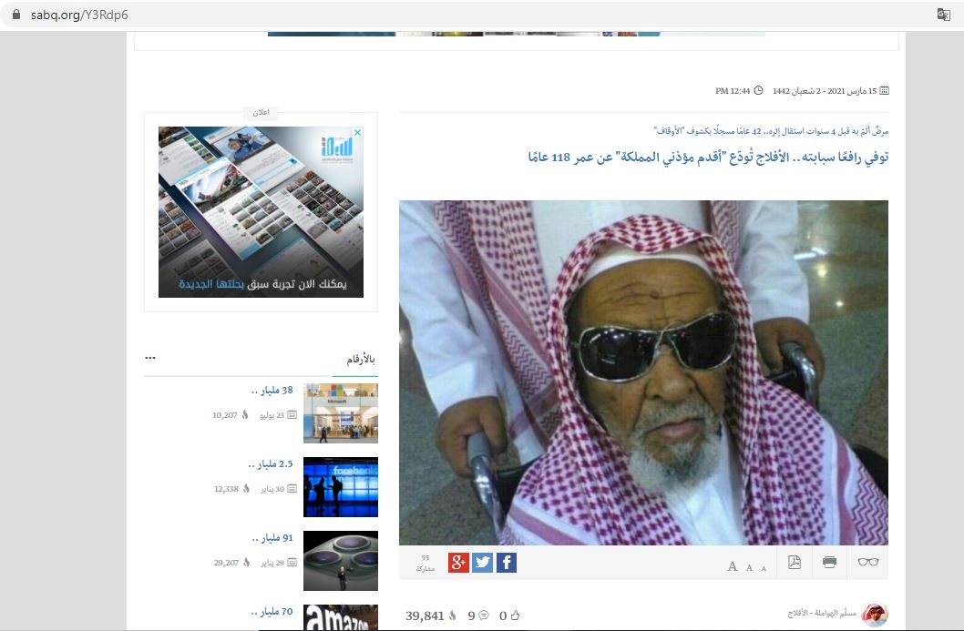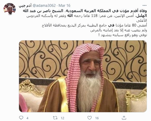 وكتبت سبق: "توفي، اليوم الاثنين، أقدمُ المؤذنين في مركز البديع بمحافظة الأفلاج، عن عمر يناهز 118 عامًا، إثر مرض أَلَمّ به وغيّبه عن مسجده، بعد أن أمضى 80 عامًا مؤذنًا في جامع البطينة بالبديع.