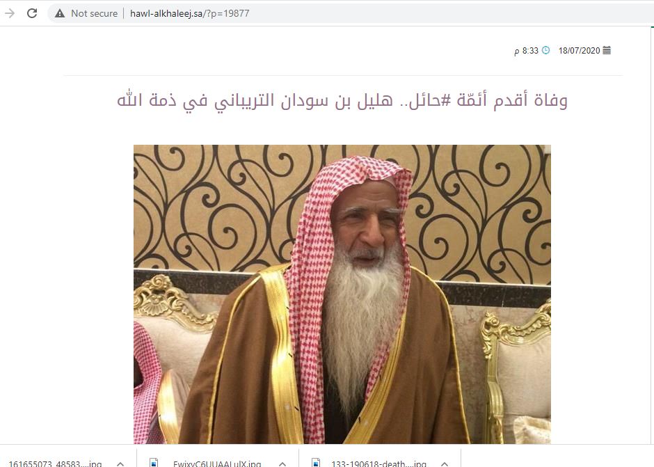 يقود البحث العسكي عن الصورة المتناقلة، بواسطة غوغل، الى مواقع اخبارية (هنا، هنا، هنا، هنا، هنا...) نشرتها في 18 تموز 2020 ضمن تقرير عن وفاة "أقدم خطيب جامع ومؤذن في منطقة حائل الشيخ هليل بن سودان الشمري، في 16 تموز 2020، بقرية قصير بن متروك، 120 كلم جنوب شرق حائل (بالسعودية)، وذلك بعد صراع مع المرض". و"يعد الشمري من أوائل المشايخ الذين تخرجوا من مدرسة العلوم الشرعية بالمدينة المنورة. وأمضى أكثر من 60 عاما يؤذن للصلاة منذ عام 1374هـ، إذ يعتبر أقدم خطيب جامع في حائل".