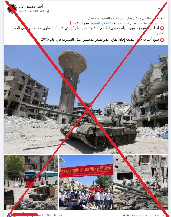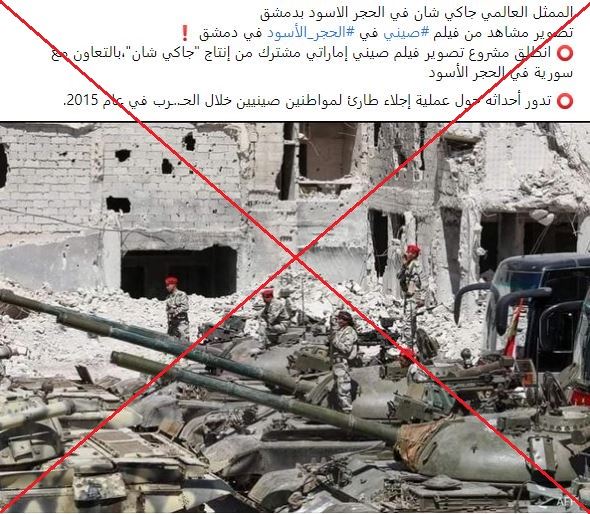 تناقلت صفحات وحسابات سوريّة على مواقع التواصل الاجتماعي منشورات تدّعي أنّ الممثل الصّيني جاكي شان موجود في دمشق خلال عمليات تصوير مشاهد فيلم من إنتاجه. لكن هذه الأنباء غير صحيحة، وجاكي شان لم يزر دمشق في حياته.