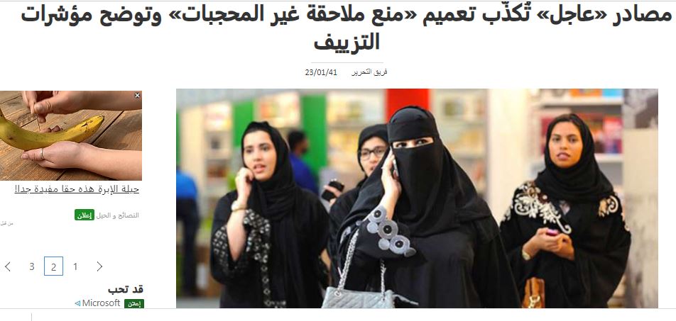 الوقائع: "ألغوا فرض الحجاب بالسعودية". بهذا العنوان، يتم التشارك في التعميم، لا سيما عبر الواتساب. ورقة تحمل اسم وزارة الداخلية السعودية، مع توقيع "مدير الامن العام فريق اول ركن خالد بن قرار الحربي". التاريخ: 17/1/1441 ه. وتتضمن خمس نقاط، منها أنه "يمنع منعا باتا ملاحقة المواطنات والوافدات بسبب عدم ارتداء الحجاب، اعتبارا من 24 محرم، الموافق 23 سبتمبر، والمصادف لليوم الوطني"، وايضا ""يجب الابلاغ عن اي مخالفة صادرة عن عناصر الشرطة لهذا التعميم".