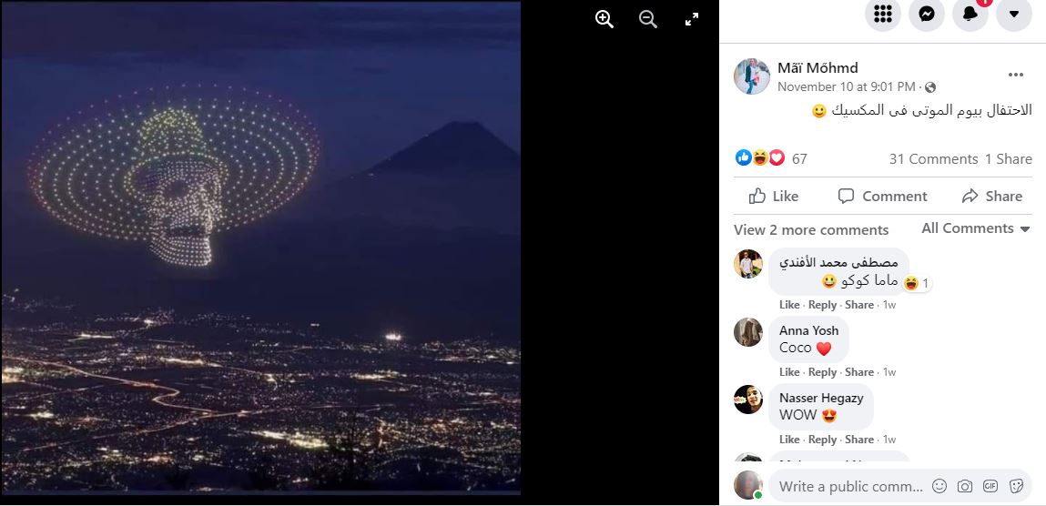 الوقائع: تنتشر الصورة بكثافة، في صفحات وحسابات، في الفايسبوك (هنا، هنا، هنا، هنا...)، وتويتر (هنا، هنا...). وقد أُرفقت بالمزاعم الآتية (من دون تدخل أو تصحيح): "الاحتفال بيوم الموتى فى المكسيك".