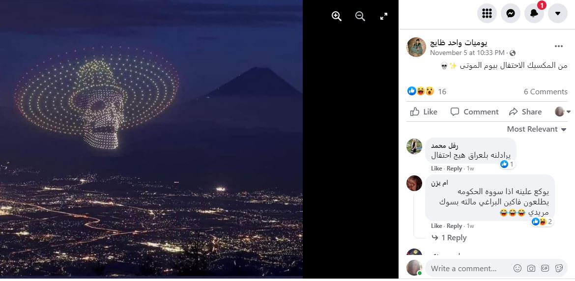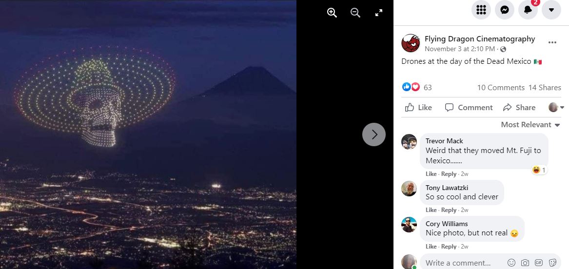 مشهد ليلي، وفي السماء شكّلت مجموعة درونات جمجمة كبيرة مضاءة. الصورة "من المكسيك"، وفقا للمزاعم المتناقلة، خلال "الاحتفال بيوم الموتى". غير أن هذا الادعاء لا صحة له. فالصورة معدّلة رقميا، ولا علاقة لها بالمكسيك. والصورة الاصلية تظهر في الحقيقة جبل فوجي في اليابان، وهي تعود الى عام 2014. FactCheck#