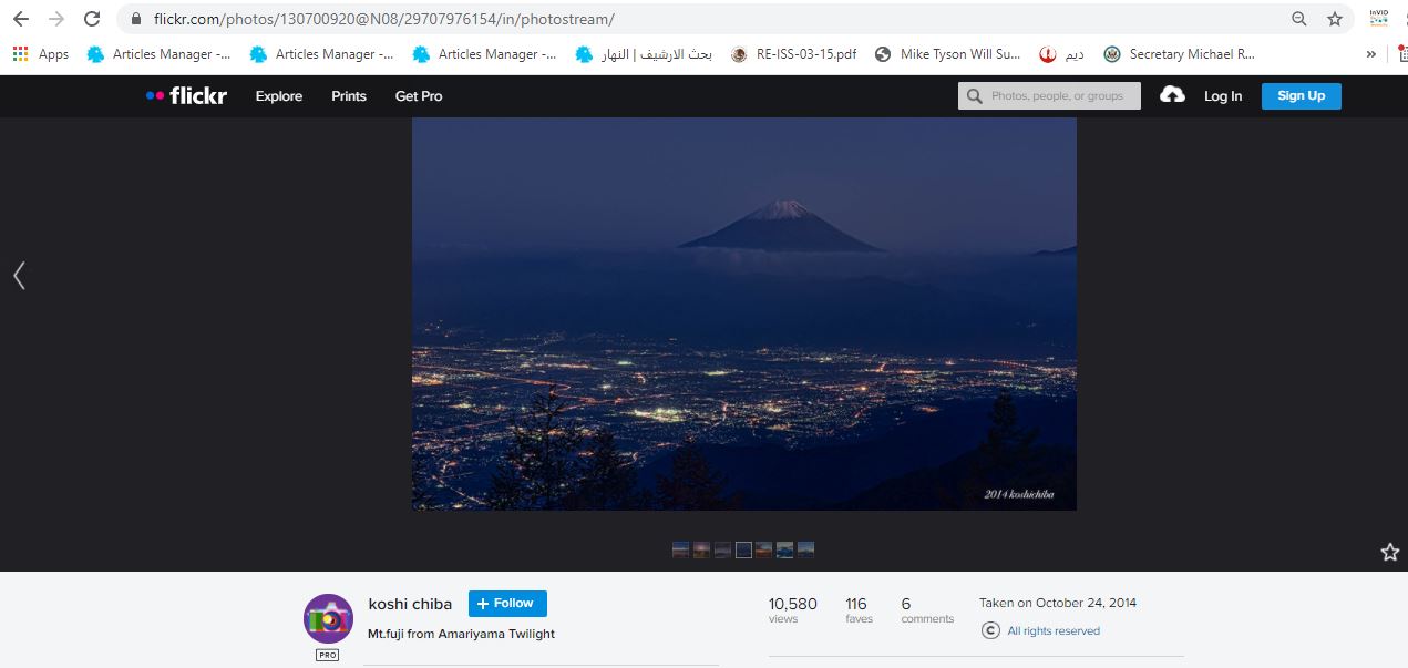 فالبحث العكسي عنها يقودنا الى الصورة الاصلية، ومصدرها الأول حساب كوشي شيبا koshi chiba في فليكر Flickr (هنا)، الذي نشرها في 24 تشرين الاول 2014، مرفقة بشرح انها لقطة "لجبل فوجي (اليابان) من أمارياما عند الغسق".