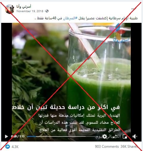 وجاء فيه أن طبيبة اكتشفت عصيراً يقتل السرطان في 48 ساعة، وهو عبارة عن "خلاصة الهندباء البرية الممزوجة مع مكوّنات أخرى من الخضار والفاكهة". وبحسب الفيديو، فإن الهندباء "التي تتمتّع بخصائص مضادة للسموم تدفع الخلايا السرطانيّة إلى الانتحار".
