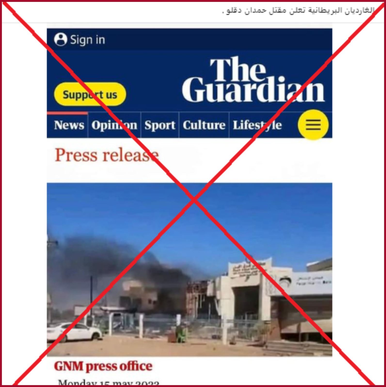 اسم The Guardian يعلو صورة تظهر دخانا يتصاعد في مكان ما. وقد ارفقت ببيان صحافي Press Realease مؤرّخ في 15 ايار 2023، وجاء فيه ان "قائد قوات الدعم السريع محمد حمدان دقلو قُتِل صباح اليوم في مستشفى شرق النيل من جراء غارة".
