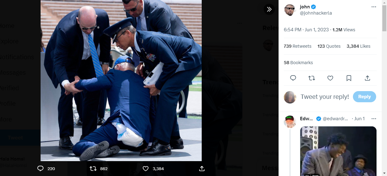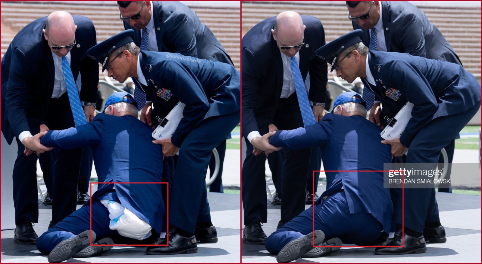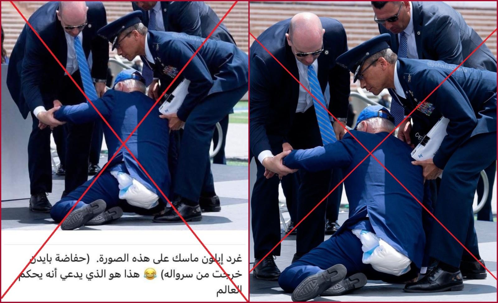 في الحقيقة، استخدم johnhackerla@ هذه المرة، في عملية التركيب، صورة أصلية نشرتها وكالة Getty Images (هنا)، الخميس 1 حزيران 2023، للرئيس الاميركي جو بايدن يوم تعثر وسقط ارضا على منصة بعد القائه خطابا خلال احتفال تخرج في أكاديمية سلاح الجو في كولورادو.