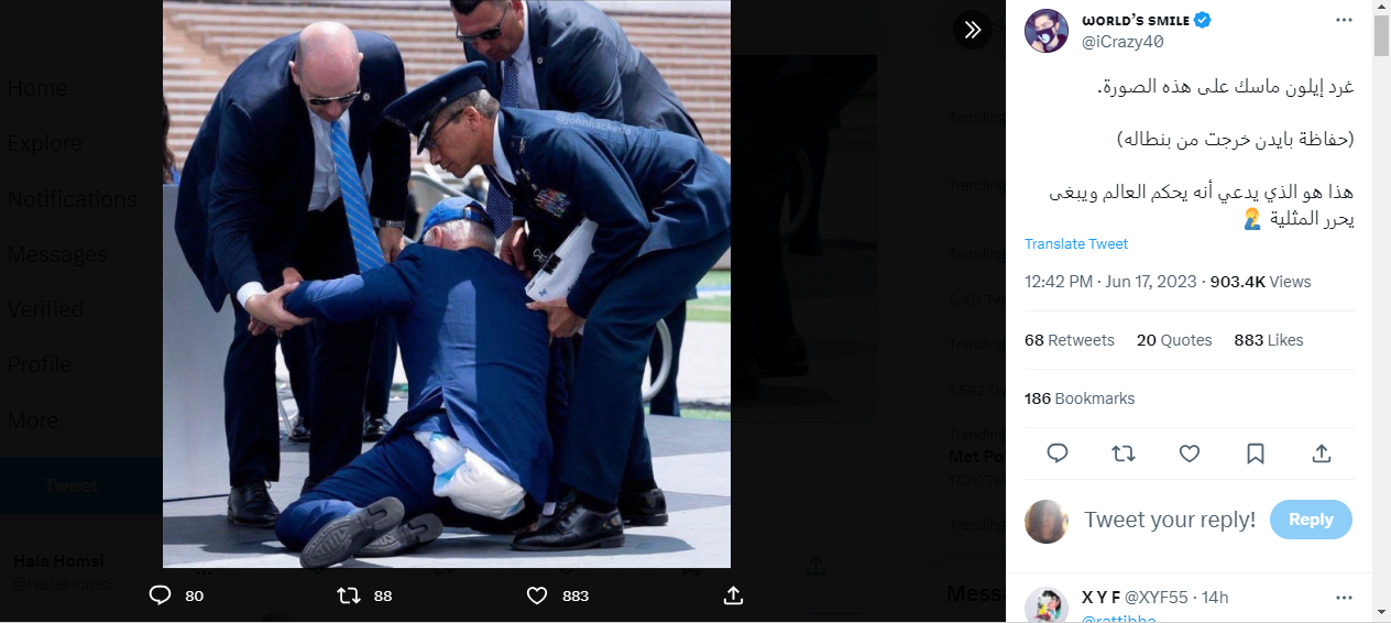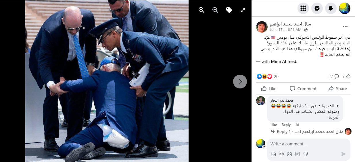 تظهر الصورة شخصا من الخلف وقع ارضا، بينما تجمع حوله اشخاص لمساعدته. وقد تكثف التشارك فيها أخيرا، عبر حسابات، ارفقتها بالمزاعم الآتية (من دون تدخل او تصحيح): "غرّد الملياردير العالمي إيلون ماسك على هذه الصورة (حفاضة بايدن خرجت من سرواله) هذا هو الذي يدعي أنه يحكم العالم".