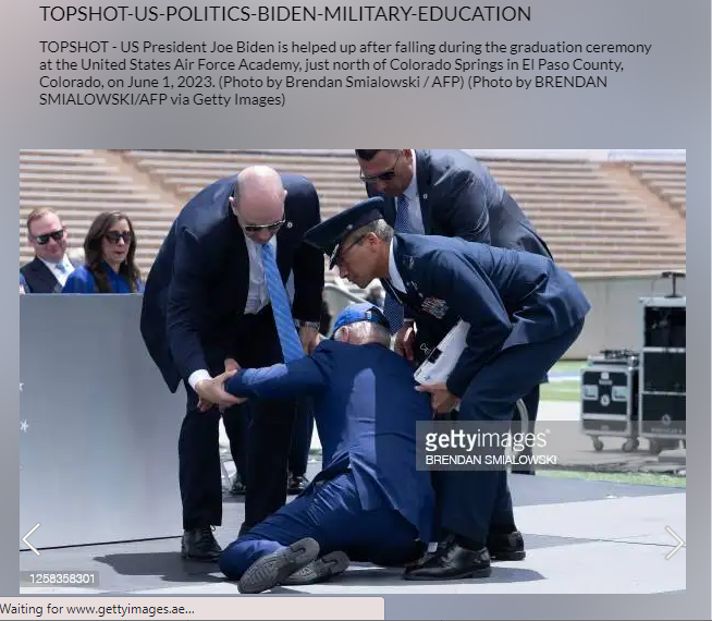 وشرحت الوكالة مع الصورة: "تمت مساعدة الرئيس بايدن بعد سقوطه خلال احتفال تخرج في أكاديمية القوات الجوية الأميركية شمال كولورادو سبرينغز في مقاطعة إل باسو بكولورادو، في 1 حزيران 2023".