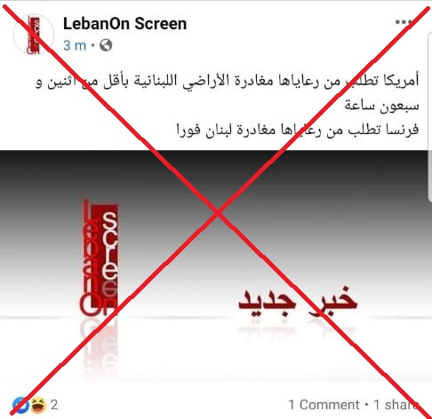 يتداول مستخدمون لوسائل التواصل الاجتماعي في لبنان، لا سيما عبر الواتساب، خبرا يدّعي أن "أميركا طلبت من رعاياها مغادرة الأراضي اللبنانية خلال أقل من 72 ساعة، وفرنسا طلبت من رعاياها مغادرة لبنان فورا". غير أن "هذا الخبر عار من الصحة"، بتأكيد من مصادر في السفارة الاميركية في بيروت، وايضا من مصادر أخرى مطلعة، لـ"النهار". FactCheck#