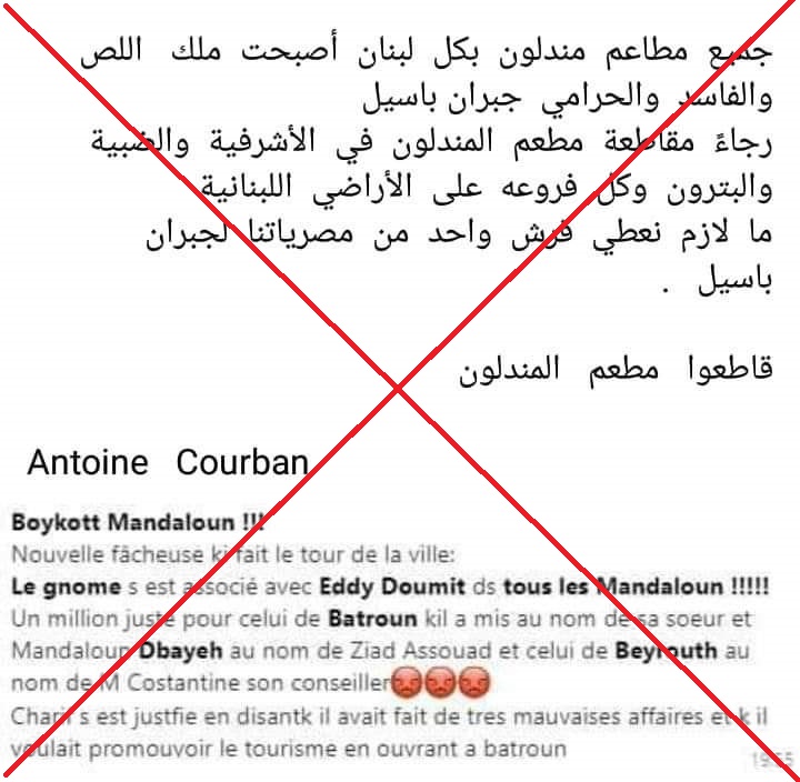 الوقائع: التشارك في المنشور تكثّف أخيراً، عبر صفحات في الفايسبوك (هنا، هنا، هنا...)، وايضا عبر الواتساب. ووفقاً لما يزعمه المنشور، فإن "جميع مطاعم المندلون في لبنان أصبحت ملك جبران باسيل"، داعيا الى "مقاطعة" المطعم بمختلف فروعه في لبنان.