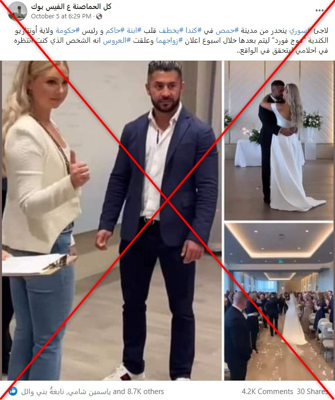 يتضمّن المنشور مجموعة من الصور لما يبدو أنّه زفاف. وجاء في التعليق المرفق "لاجئ سوري في كندا ينحدر من مدينة حمص يخطف قلب ابنة حاكم ورئيس حكومة ولاية أونتاريو الكندية دوغ فورد".