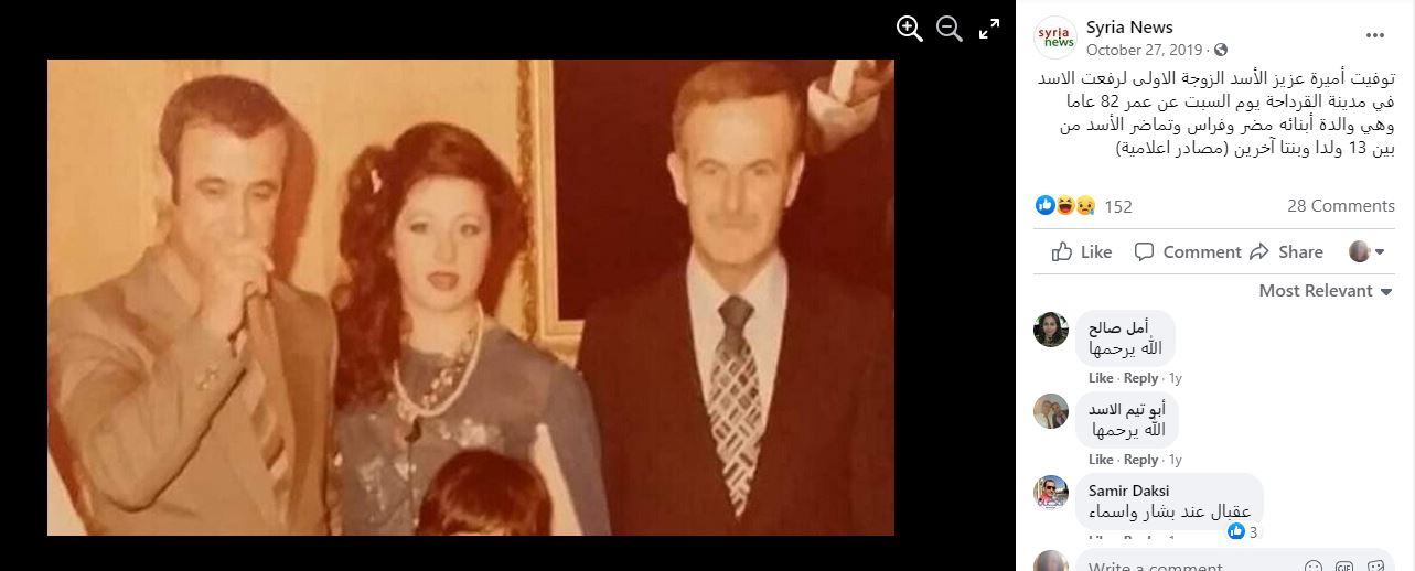 فالبحث العكسي عن الصورة يقودنا الى مواقع اخبارية لبنانية وعربية نشرتها في 27- 28 تشرين الاول 2019 (هنا، هنا، هنا، هنا، هنا، هنا، هنا، هنا، هنا، هنا، هنا...)، ضمن تقرير عن وفاة أميرة عزيز الأسد، زوجة رفعت الاسد شقيق الرئيس السوري الراحل حافظ الاسد، في مدينة القرداحة في محافظة اللاذقية بسوريا.