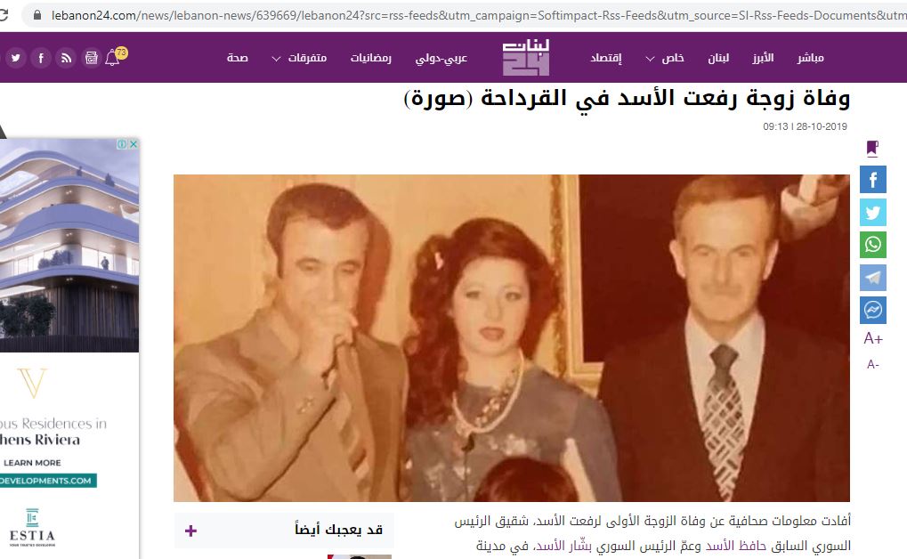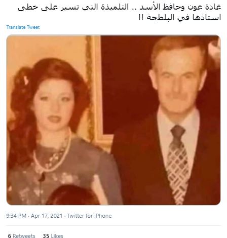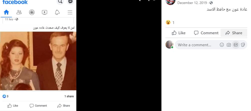 يدعي مستخدمون لوسائل التواصل الاجتماعي ان الصورة التي ينشرونها تظهر النائبة العامة الاستئنافية في جبل لبنان القاضية غادة عون الى جانب الرئيس السوري الراحل حافظ الاسد. غير ان هذه المزاعم لا صحة لها. المرأة التي تظهر في الصورة هي أميرة عزيز الأسد، الزوجة الأولى لرفعت الأسد، شقيق الأسد، وقد أُعلِنت وفاتها في 26 تشرين الأول 2019. FactCheck#
