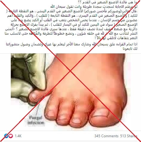 يتحدّث المنشور عن تدليك إصبع القدم الأصغر، وجاء فيه: "الإصبع الصغيرة في القدم اليمنى يعكس الكبد في حين يعكس إصبع القدم اليسرى القلب". ويخرج المنشور بخلاصة أن "مجرّد فرك الإصبع بحركة دائرية عند الشعور بالتعب في هذين العضوين له فوائد مذهلة".