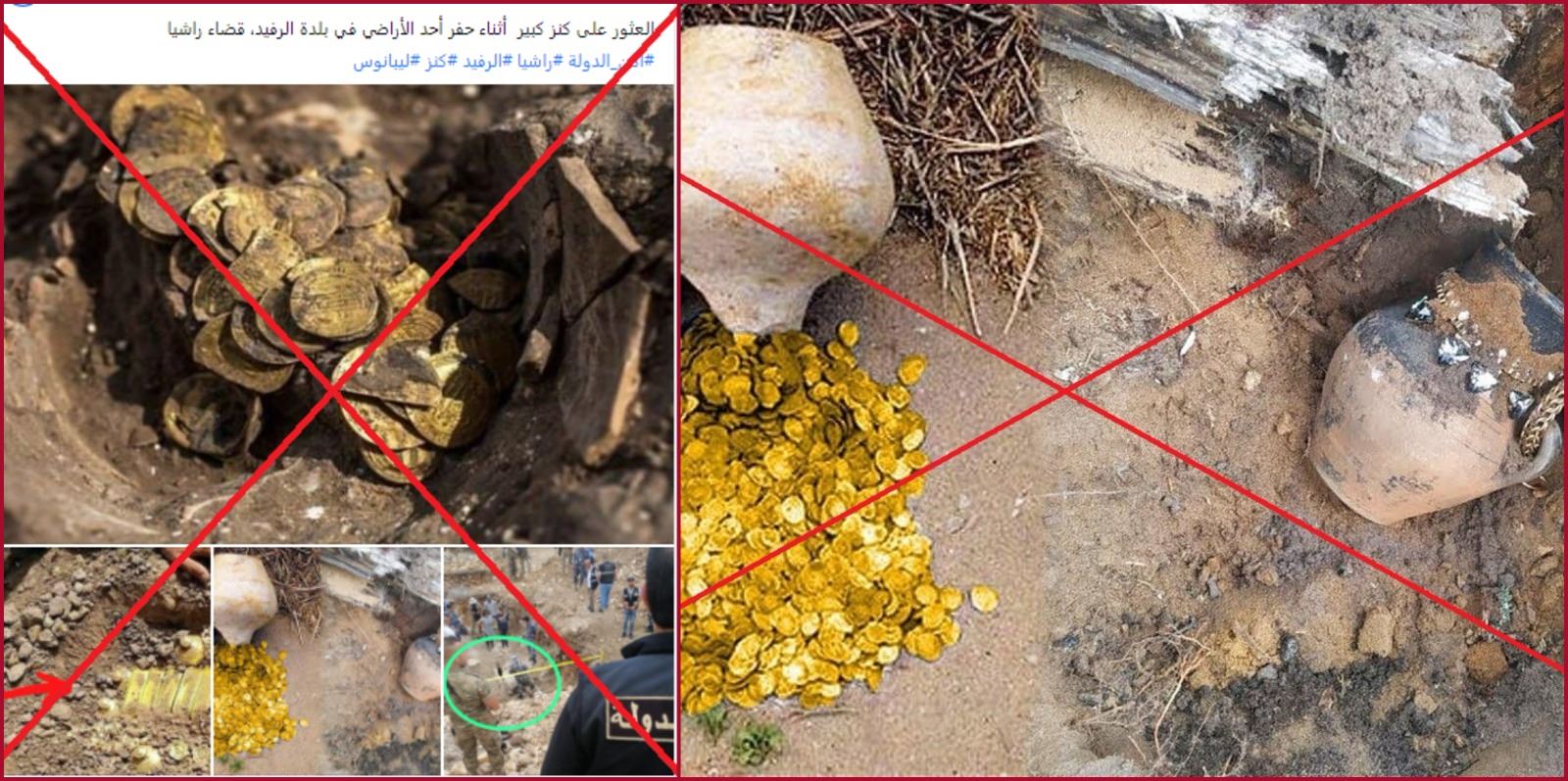 ثلاث صور قيد التداول، تظهر فيها نقود قديمة من ذهب في خواب، على ما يبدو. وقد تكثف التشارك فيها أخيرا، عبر حسابات ومواقع اخبارية، ارفقتها بالمزاعم الآتية (من دون تدخل او تصحيح): "العثور على كنز كبير أثناء حفر أحد الأراضي في بلدة الرفيد قضاء راشيا"، وايضا "العثور على خوابي من الذهب مدفونة في هذه البلدة".