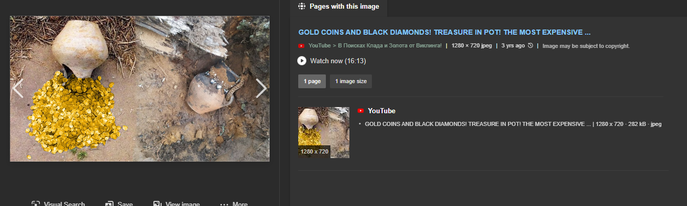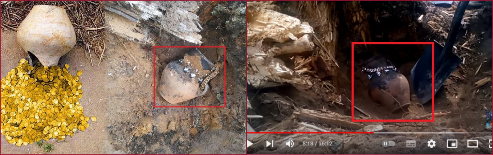 تقودنا الخيوط الى فيديو منشور في قناة wikling@ (هنا) في 27 شباط 2020، بعنوان "العثور على عملات ذهبية وماسات سود، كنز في وعاء"، حيث نشاهد الجرة ذاتها التي نراها في الصورة الى اليمين، خلال عملية "نبش الكنز".