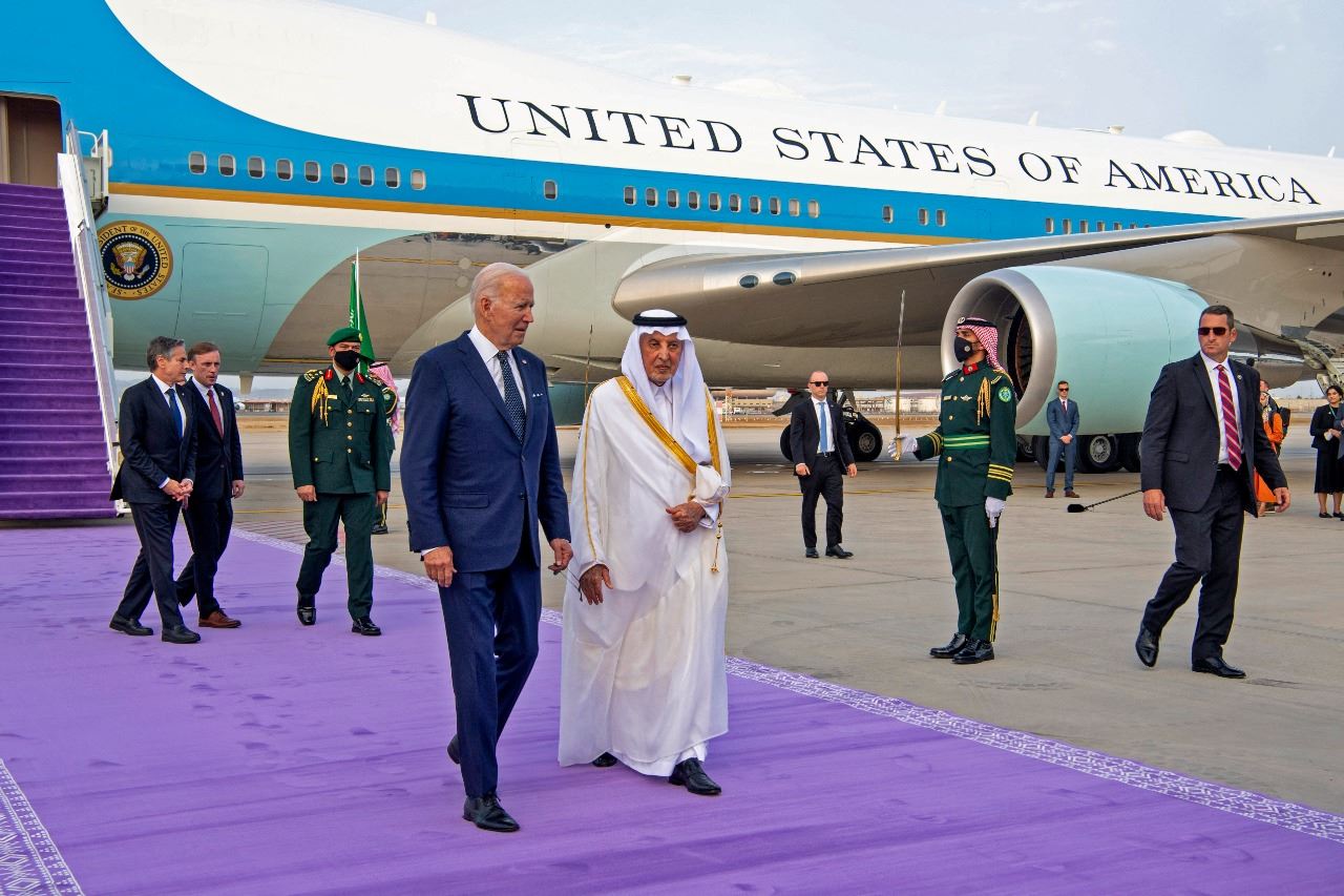 بايدن يمشي على سجادة بنفسجية خلال استقبال امير منطقة مكة الأمير خالد الفيصل له لدى وصوله إلى مطار جدة (15 تموز 2022، أ ف ب).