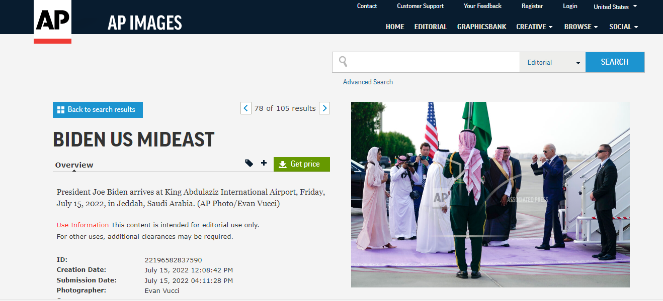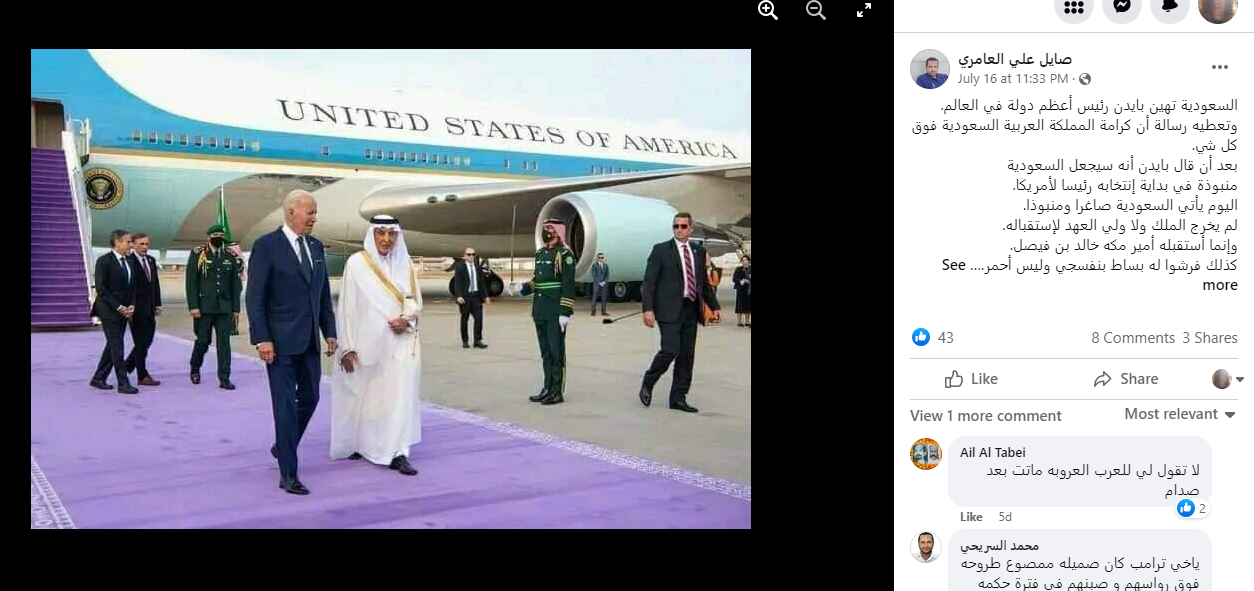الوقائع: منذ ايام، تنتشر منشورات لمستخدمي وسائل التواصل الاجتماعي حول السجادة البنفسجية التي مدت في استقبال الرئيس الاميركي جو بايدن في مطار جدة في جدة بالسعودية، لدى وصوله اليها، الجمعة 15 تموز 2022. ومما جاء في منشورات ان "لون السجادة البنفسجي الذي اختارته السعودية في استقبال بايدن يشير الى انها دولة مستقلة لا تحتاج إلى تبعية أو حماية أميركية" (مثل هنا، هنا، هنا)، او يراد به "تقليل مقام بايدن واهانته" (هنا، هنا، هنا، هنا، هنا). وقد أرفقت هذه المنشورات بصور للسجادة البنفجسية عند الطائرة الرئاسية الاميركية في مطار جدة.