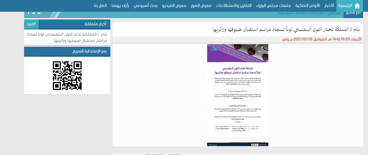 فقد اعلنت السعودية، في 5 ايار 2021، انها اختارت اللون البنفسجي لوناً معتمداً لسجاد مراسم استقبال ضيوف الدولة الرسميين من رؤساء ووزراء وسفراء، ومُمثلي الدول الشقيقة والصديقة، إضافة إلى السجاد المستخدم في مختلف المناسبات الرسمية، على ما أوردت وكالة الانباء السعودية (هنا).