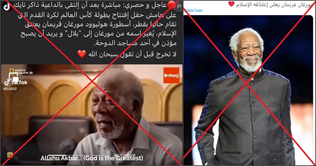 يتداول مستخدمون لوسائل التواصل الاجتماعي خبرا ان النجم الاميركي الشهير مورغان فريمان "أشهر اسلامه بعد افتتاح مونديال قطر 2022" في كرة القدم في قطر مساء الاحد 20 تشرين الثاني 2022. وقد نشر مستخدمون فيديو يظهر فيه فريمان رافعا الأذان، دليلا مزعوما على ذلك. غير أنّ هذا الخبر غير صحيح. والمقطع المصوّر مجتزأ من حلقة قديمة من المسلسل الوثائقي "قصة الله"، من تقديم فريمان، وخلالها حاول رفع الأذان خلال زيارته القاهرة، في إطار البحث عن طريقة تواصل مختلف الأديان مع الله. FactCheck#