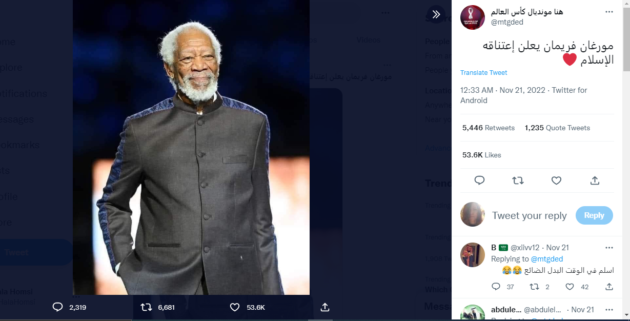 الوقائع: التشارك في الخبر والفيديو تكثّف أخيراً، عبر صفحات وحسابات (هنا، هنا، هنا، هنا...). ووفقا للمزاعم المتناقلة، فإن "مورغان فريمان أعلن اعتناقه الإسلام"، وايضا "بعدما التقى فريمان الداعية ذاكر نايك على هامش افتتاح المونديال في قطر، اعتنق الاسلام وغيّر اسمه من مورغان الى بلال ويريد ان يصبح مؤذنا في أحد مساجد الدوحة".