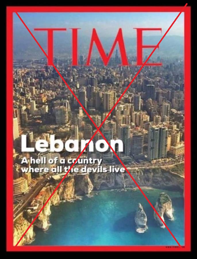 ما تداوله مستخدمون لوسائل التواصل الاجتماعي من صورة لغلاف مجلة "التايم" الأميركية، وعليه صورة جوية لبيروت مع عنوان عريض: "لبنان جحيم بلد حيث يعيش كلّ الشياطين"، وفقا للترجمة الى العربية، غلاف مفبرك. مجلة "التايم" لم تنشر غلافاً وعنواناً مماثلين.