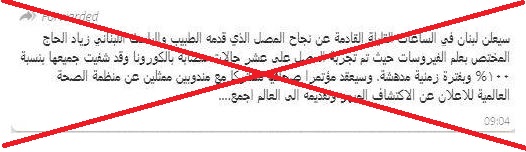 كلا، "لم يعلن لبنان نجاح المصل الذي قدمه الطبيب والباحث اللبناني زياد الحاج المختص بعلم الفيروسات، بحيث تمّت تجربة المصل على عشر حالات مصابة بالكورونا، وقد شفيت جميعها بنسبة ١٠٠% وبفترة زمنية مدهشة...". هذا الخبر الذي تناقله كثر، لا سيما عبر الواتساب، عار من الصحة، بتأكيد من وزارة الصحة اللبنانية، وايضا من العالم زياد الحاج الذي أكد لـ"النهار" أن "لا علاقة له بلقاح يتعلق بفيروس كورونا المستجد".