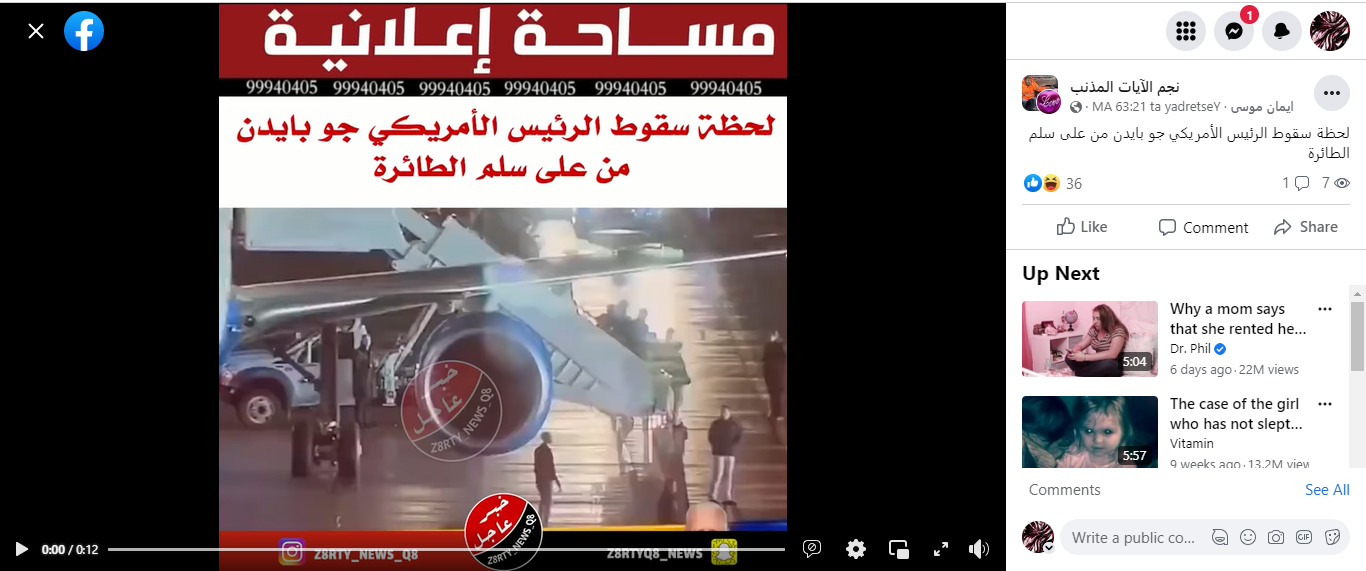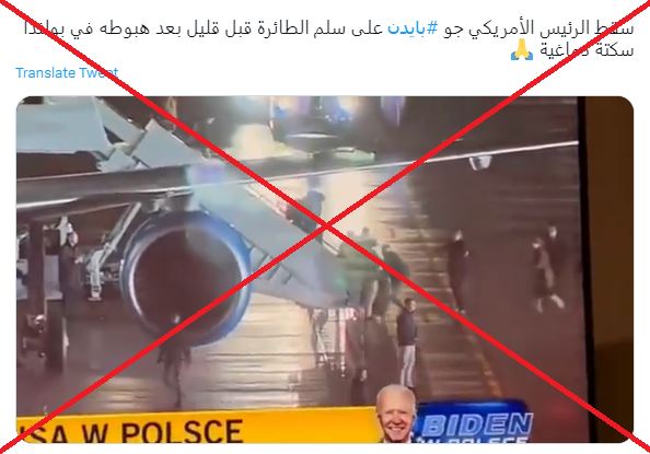 12 ثانية فقط. المشاهد الجانبية الليلية تظهر شخصاً غير معلوم ينزلق بسرعة على سلم طائرة، خلال نقل اعلامي، على ما يبدو، لوصول الرئيس الاميركي جو بايدن الى وارسو، الاثنين 20 شباط 2023. وقد تكثّف التشارك في الفيديو في الساعات الماضية، عبر حسابات عربية وأجنبية (هنا، هنا، هنا، هنا، هنا، هنا، هنا، هنا...)، أرفقته بالمزاعم الآتية (من دون تدخل او تصحيح): "سقوط الرئيس الأمريكي جو بايدن على سلم الطائرة قبل قليل بعد هبوطه في بولندا إثر سكتة دماغية".