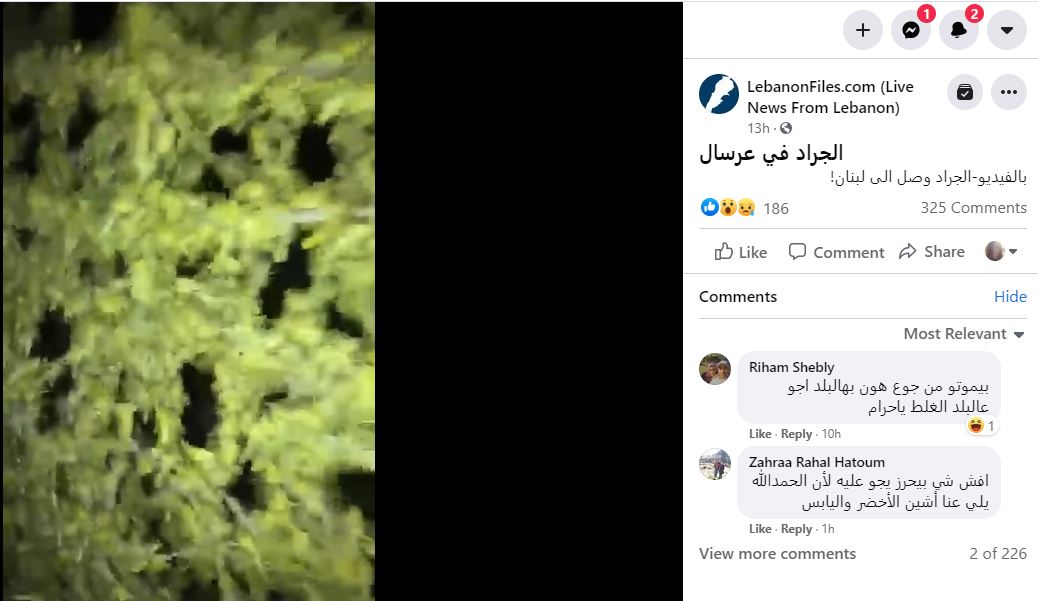 يتناقل مستخدمون لوسائل التواصل الاجتماعي مقطعاً مصوراً بمزاعم انه يظهر "الجراد في عرسال" في قضاء بعلبك بلبنان. صحيح ان الجراد الصحراوي وصل الى لبنان بحيث رصدها أحد المزارعين في جرود بلدتي عرسال ورأس بعلبك الحدودية، محلّة خربة داود، في جهة السلسلة الشرقية لجبال لبنان، غير أن الفيديو المتناقل لا علاقة له بلبنان، ولا بسوريا كما يتم زعمه أيضاً. وقد أمكن ايجاده منشوراً قبل يومين من رصد الجراد في لبنان، في 22 نيسان 2021. وقد التُقط في منطقة الحفير بحائل في السعودية. FactCheck#