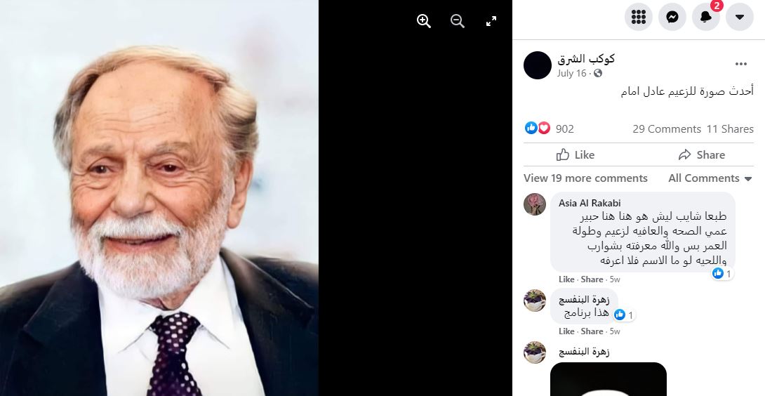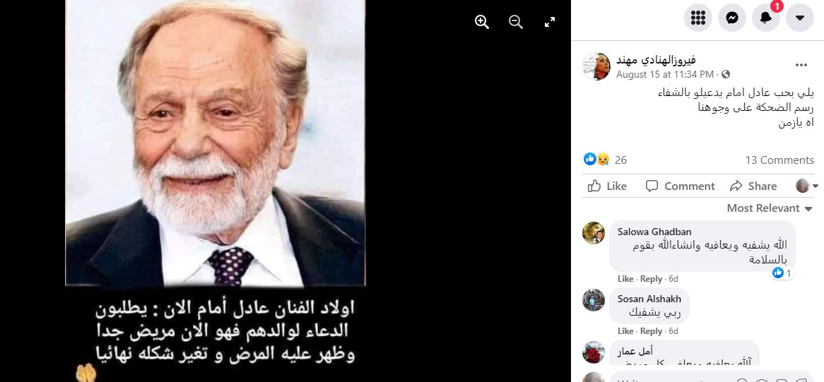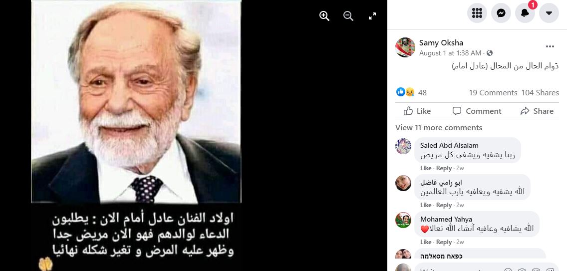 الوقائع: التشارك في الصورة تكثف أخيرا، عبر صفحات في الفايسبوك (هنا، هنا...)، مرفقة بالمزاعم الآتية (من دون تدخل أو تصحيح): "أولاد الفنان عادل امام الان : يطلبون الدعاء لوالدهم فهو الان مريض جدا وظهر عليه المرض وتغير شكله نهائيا". كذلك، تنشر صفحات وحسابات الصورة ذاتها بمزاعم انها "احدث صورة للزعيم عادل امام" (هنا، هنا، هنا، هنا، هنا، هنا، هنا، هنا، هنا...).