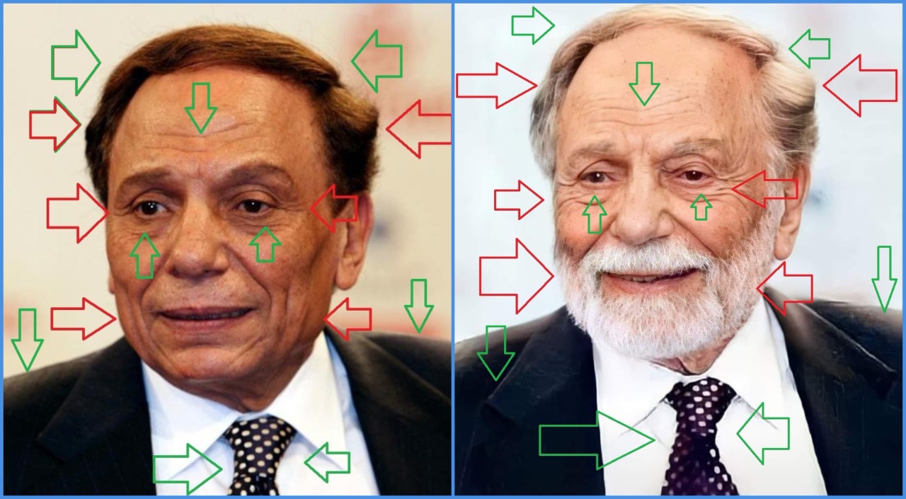 واليكم مقارنة بين الصورتين، الاصلية (ادناه الى اليسار)، والمتناقلة غير الحقيقية (الى اليمين). وقد اشرنا بالاحمر الى الاضافات الرقمية التي ادخلت الى الصورة الاصلية، وبالاخضر الى العناصر المشتركة بين الصورتين، ومنها عينا عادل إمام وجبينه وتصفيفة شعره وربطة عنقه وبدلته.