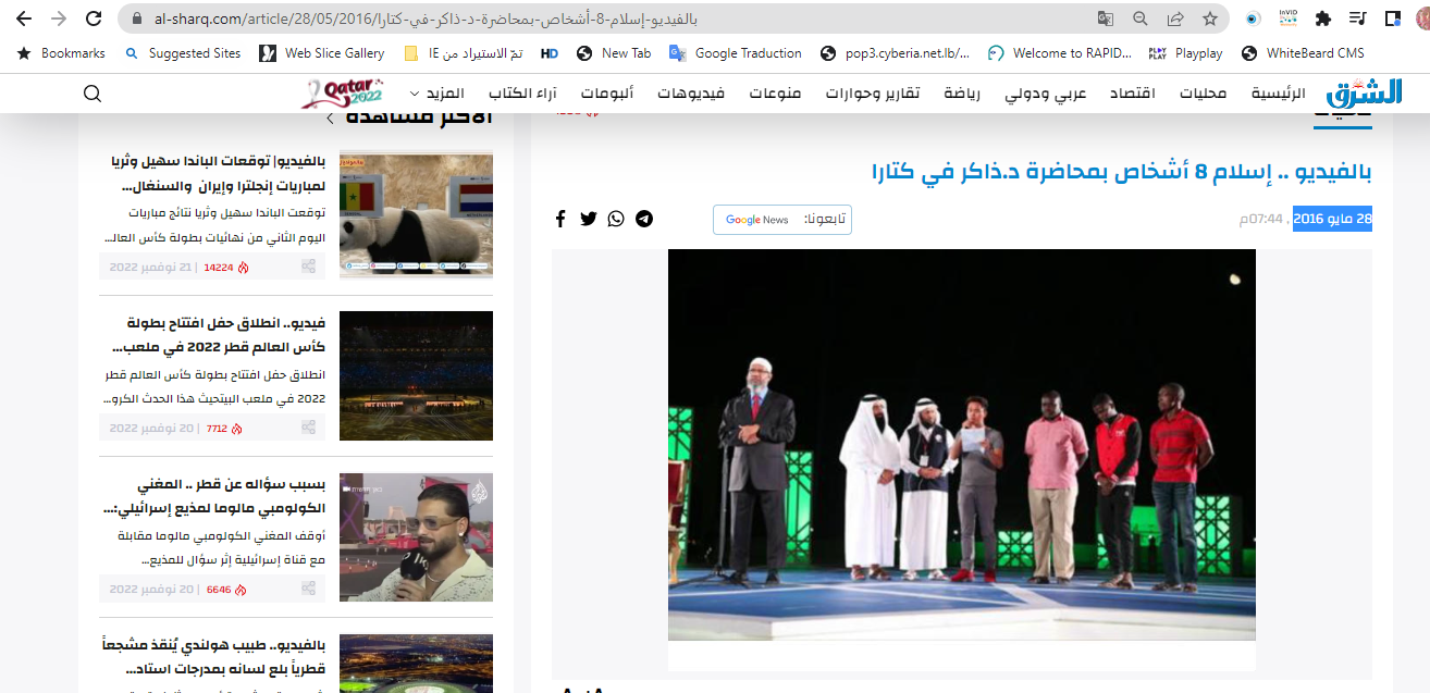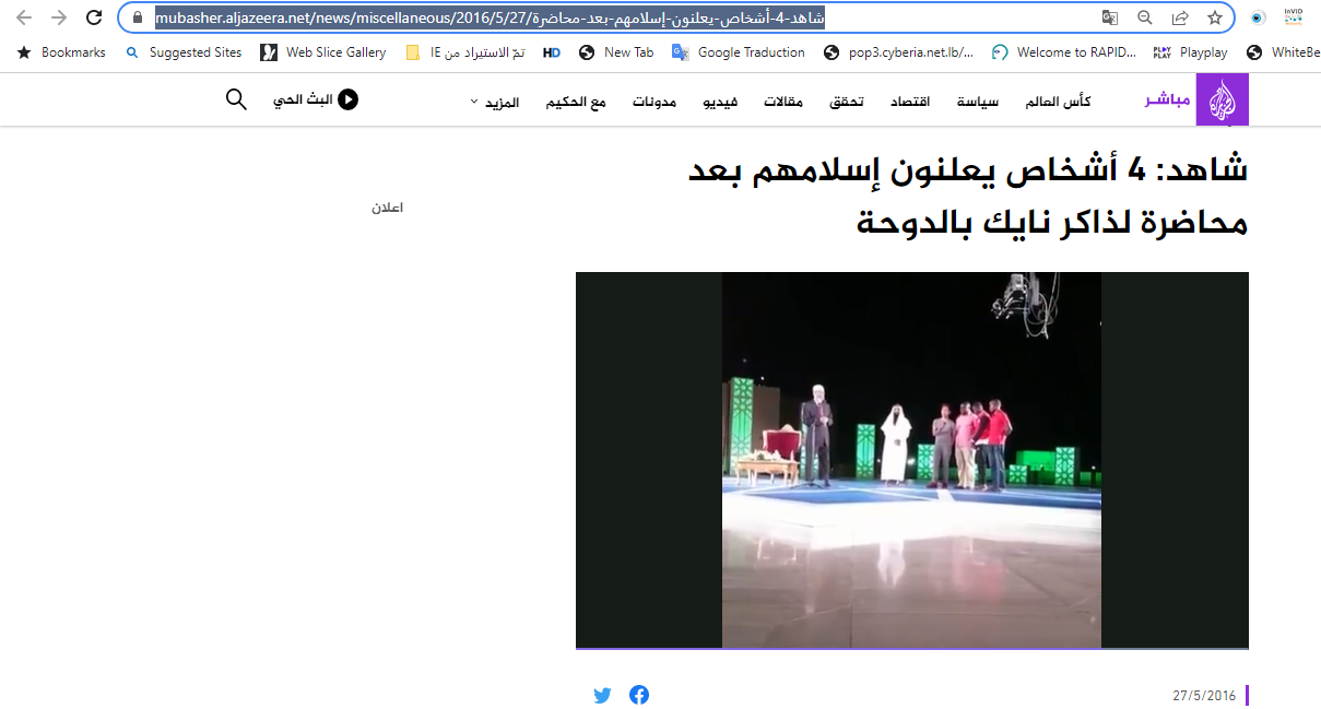واورد ان "أربعة أشخاص أعلنوا دخولهم الدين الإسلامي الخميس (26 ايار 2016) بعد محاضرة في كتارا بالدوحة للداعية الإسلامي الهندي ذاكر نايك بعنوان هل الإله موجود؟" (هنا، وهنا ايضا).