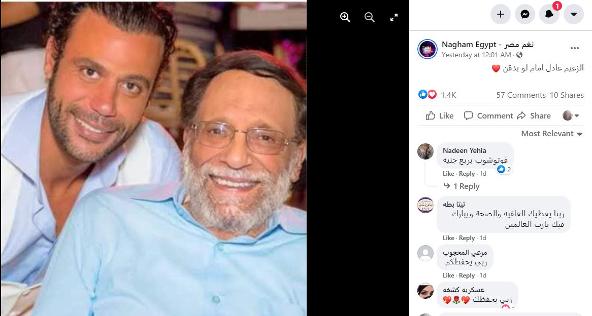 الوقائع: منذ ساعات، تكثّف تشارك الصورة عبر صفحات وحسابات، خصوصاً مصريّة، في الفايسبوك (هنا، هنا، هنا، هنا، هنا...)، وتويتر (هنا، هنا، هنا...). وقد أُرفقت بالمزاعم الآتية (من دون تدخّل أو تصحيح): "آخر (أو أحدث) ظهور للزعيم عادل إمام"، وأيضاً "الزعيم عادل امام لو بدقن"، "الزعيم عادل إمام مع نجله الفنان محمد عادل إمام"...