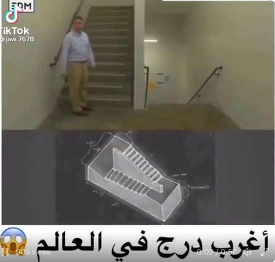 مئات آلاف المشاهدات على صفحات مواقع التواصل الاجتماعي حقّقها فيديو ادّعى ناشروه أنّه لأشخاصٍ يصعدون درجاً لانهائياً هو "الأغرب في العالم". إلا أنّ الفيديو في الحقيقة هو تمثيليّ، واستخدمت فيه تقنيات المونتاج للإيحاء بأنّه واقعيّ.