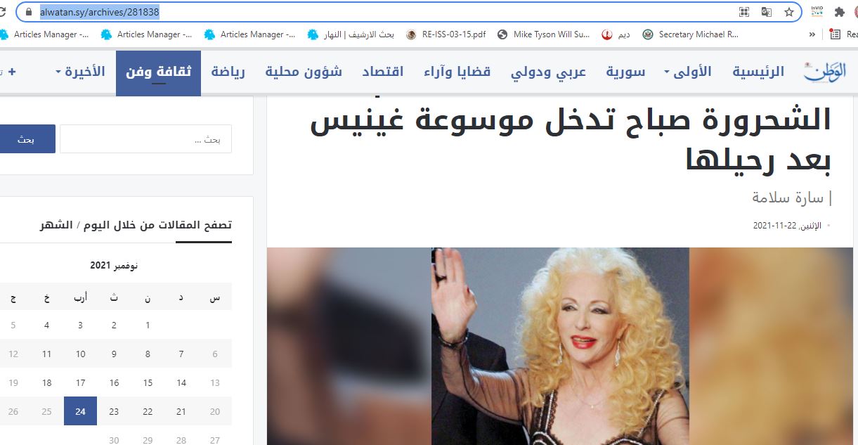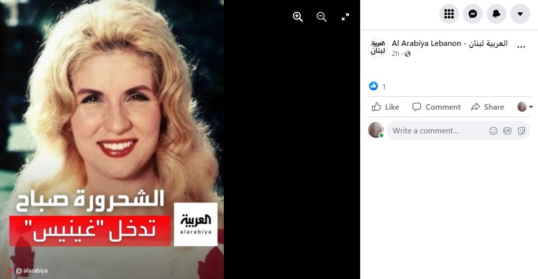 الشحرورة صباح... الفنانة اللبنانية الراحلة. والخبر عنها المتناقل في وسائل التواصل الاجتماعي ومواقع اخبارية عربية يدّعي انها "دخلت موسوعة غينيس كأكثر فنانة اعطت الفن في العالم". غير أنّ هذه المزاعم لا صحة لها. هذا الخبر شائعة قديمة ترجع إلى عام 2014. وموسوعة غينيس للأرقام القياسية لم تعلن اي شيء مماثل بخصوص الفنانة اللبنانية الراحلة. FactCheck#