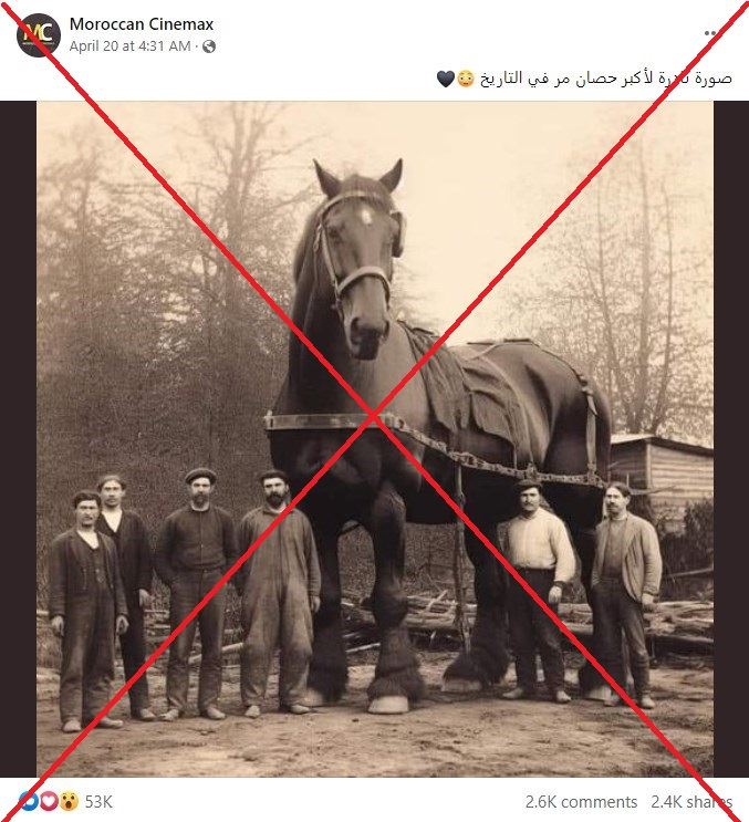 تداولت صفحات وحسابات على موقع فايسبوك صورة يظهر فيها ما يبدو أنّه حصان ضخم الحجم قيل إنّه الأكبر المعروف في التاريخ. لكن هذه الصورة ليست حقيقية بل مولّدة ببرنامج ذكاء اصطناعيّ.