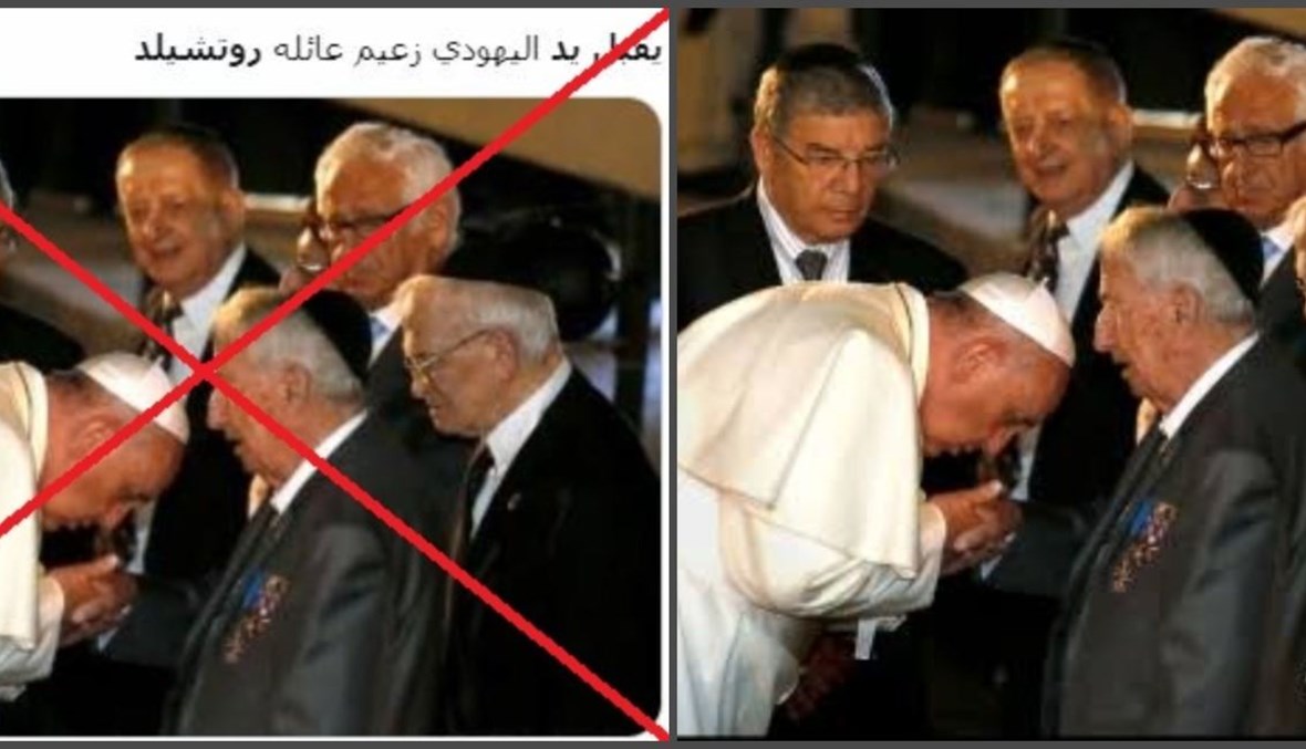 يتناقل مستخدمون لوسائل التواصل الاجتماعي صورة للبابا فرنسيس، بمزاعم انه يظهر فيها وهو "يقبّل يد اليهودي زعيم عائله روتشيلد". غير أن هذا الادعاء لا صحة له. الصورة تظهر البابا فرنسيس "مصافحاً الناجي من المحرقة إليعازر غرينفيلد، خلال زيارته نصب محرقة اليهود في الحرب العالمية الثانية (ياد فاشيم) في القدس، في 26 أيار 2014". FactCheck#