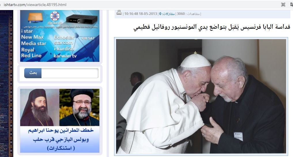 في ايار 2013، انتشرت للبابا فرنسيس صورة له مقبلا يد الأب روفائيل القطيمي، الكاهن العراقي الذي نجا من الموت في مجزرة كنيسة سيدة النجاة في بغداد في 31 تشرين الاول 2010 (وهنا ايضا).