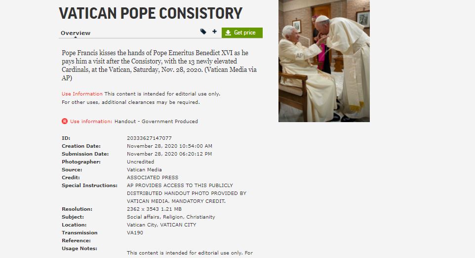 في 28 ت2 2020، انتشرت صورة للبابا فرنسيس مقبّلا يدي البابا الفخري بنديكتوس السادس عشر، خلال زيارة له بعد رسامة 13 كاردينالا جديدا في الفاتيكان.