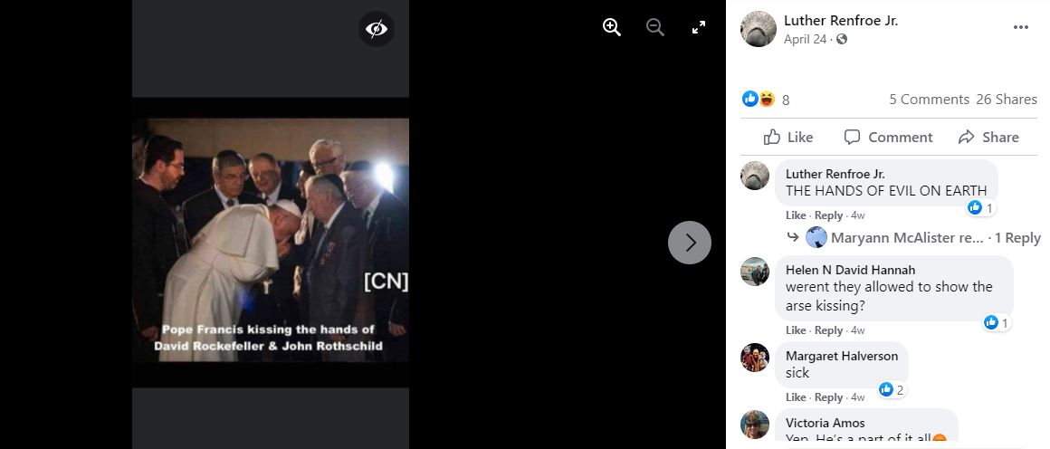 كذلك، يتم التشارك في الصورة، بالمزاعم ذاتها، عبر حسابات أجنبية (هنا، هنا...): Pope Francis Kissing the Hands of the Rockefellers & the Rothschilds، اي البابا فرنسيس مقبلا أيدي آل روكفلر وروتشيلد.